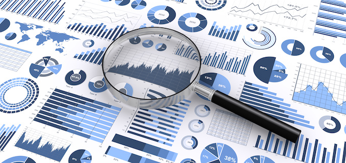 インフォグラフィックと虫メガネ、ビジネス戦略の調査
