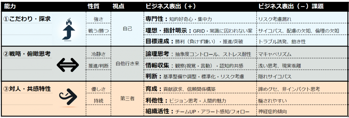 | 俯瞰・客観 | ロジカルな思考、感情のコントロール、神経の柔軟性 |
